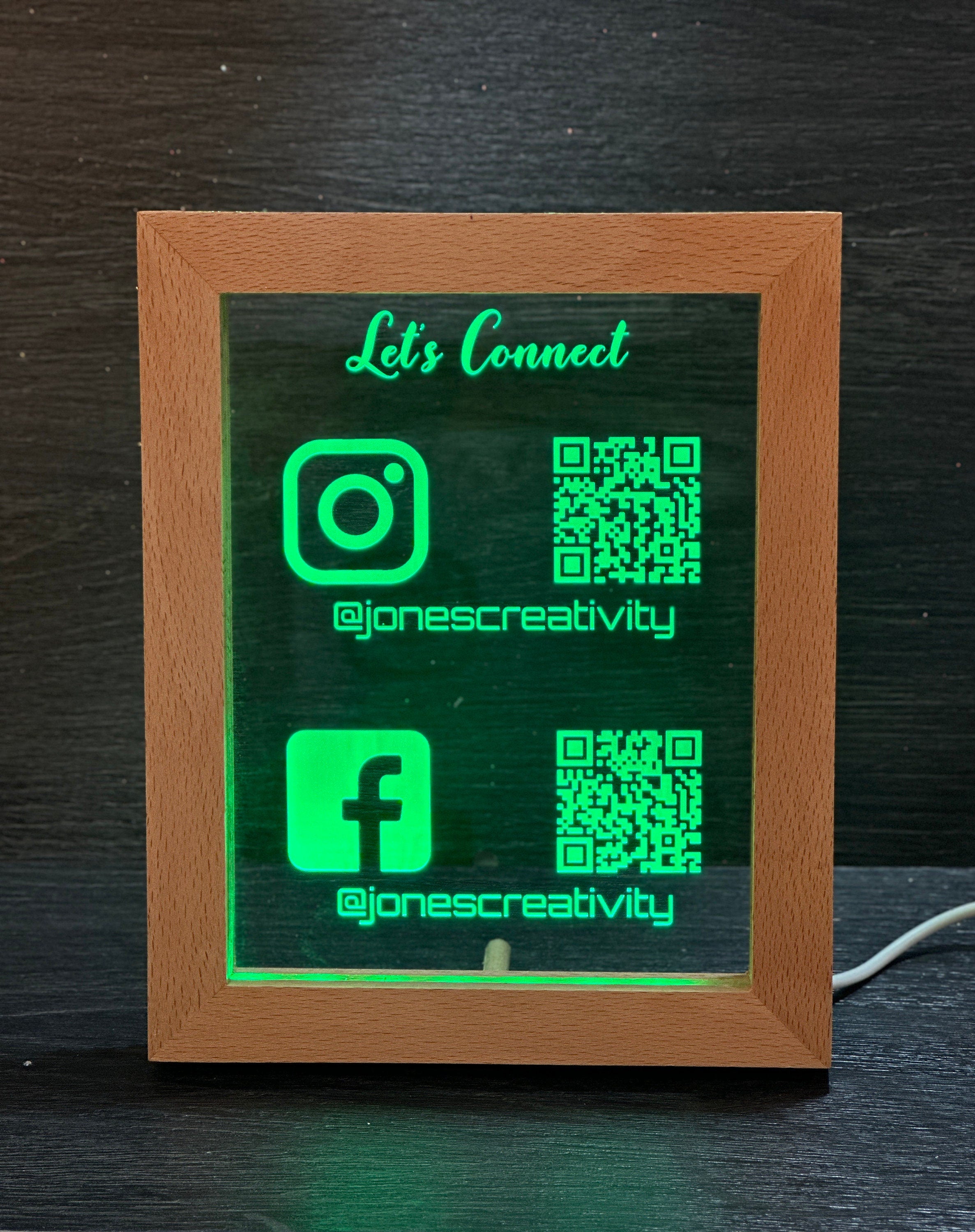 The Personalized LED QR Code Sign is a versatile LED QR code sign designed to help your customers easily access your menu, social media, or digital payment options by scanning the sign with their phone. This USB powered sign offers a seamless way to connect with your audience, boosting engagement and sales through quick, contactless interactions. Featuring an engraved acrylic panel mounted on a sturdy wood base, this business social media sign combines style with function to enhance any retail or hospitality environment.