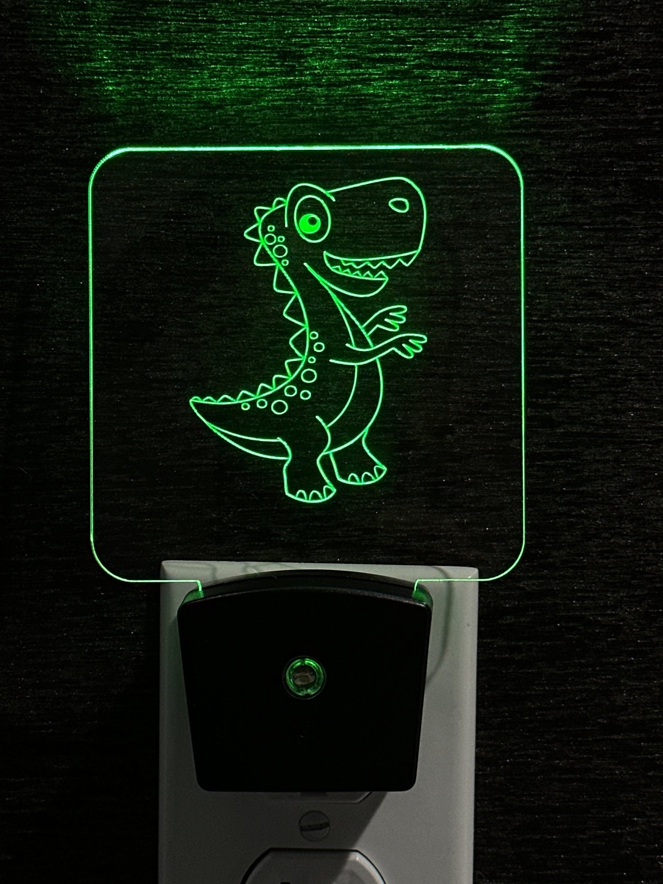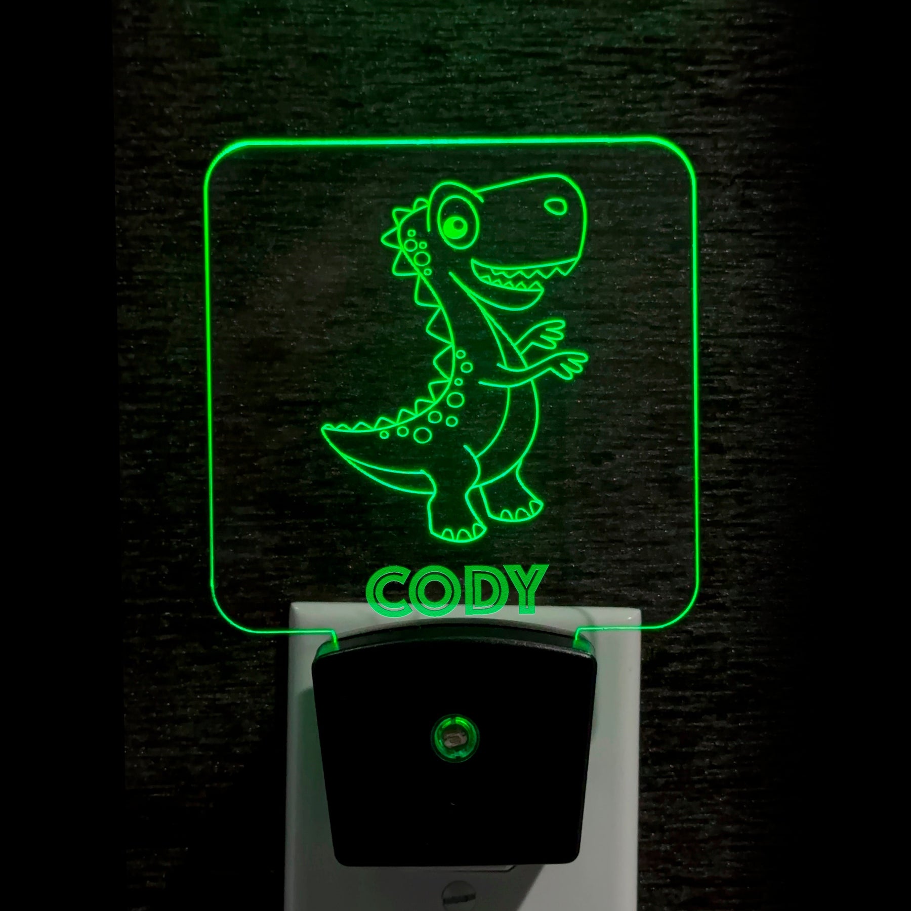 This personalized dinosaur sign is a unique LED night light designed to brighten children's rooms while adding a custom touch with your child's name. Perfect for nurseries and kids' bedrooms, this LED dinosaur lamp combines fun dinosaur-themed decor with practical, soft lighting that promotes restful sleep and comfort. The rechargeable LED sign features an engraved acrylic dinosaur panel measuring approximately 7 inches by 4 inches, mounted on a sturdy base sized 3.94 inches by 3.15 inches by 1.65 inches, making it an ideal size for bedside tables or shelves.