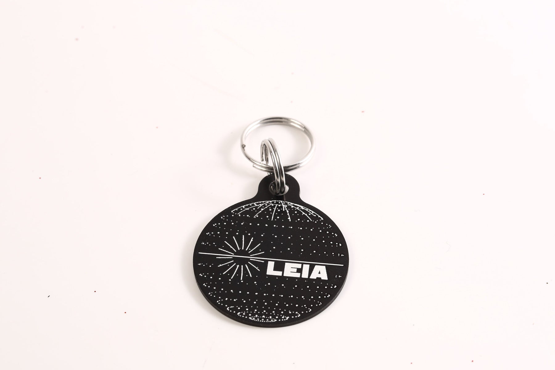 The Personalized Death Star dog tag is a unique, sci-fi pet tag designed to keep your furry friend safe while adding a touch of galactic style. Made from durable aluminum, this weatherproof pet tag ensures long-lasting identification for your dog or cat. Available in two sizes—Small (1" round) ideal for small dog breeds and cats, and Large (1.25" round) perfect for bigger dogs—the tag is 0.06" thick to withstand daily wear. Each tag comes with a sturdy ring for easy attachment to any dog collar accessory or cat collar tag.