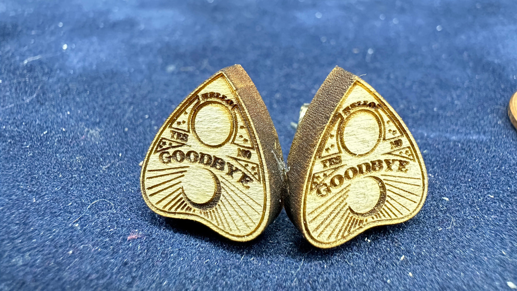 Ouija Planchette Earrings crafted from precision laser cut and engraved maple wood offer a unique way to express your style while connecting with spirit board jewelry themes. These tiny stud earrings deliver detailed craftsmanship in a lightweight design, perfect for alternative fashion jewelry lovers seeking unique spiritual accessories. Each pair features surgical steel posts with butterfly nut backs for secure, comfortable wear.