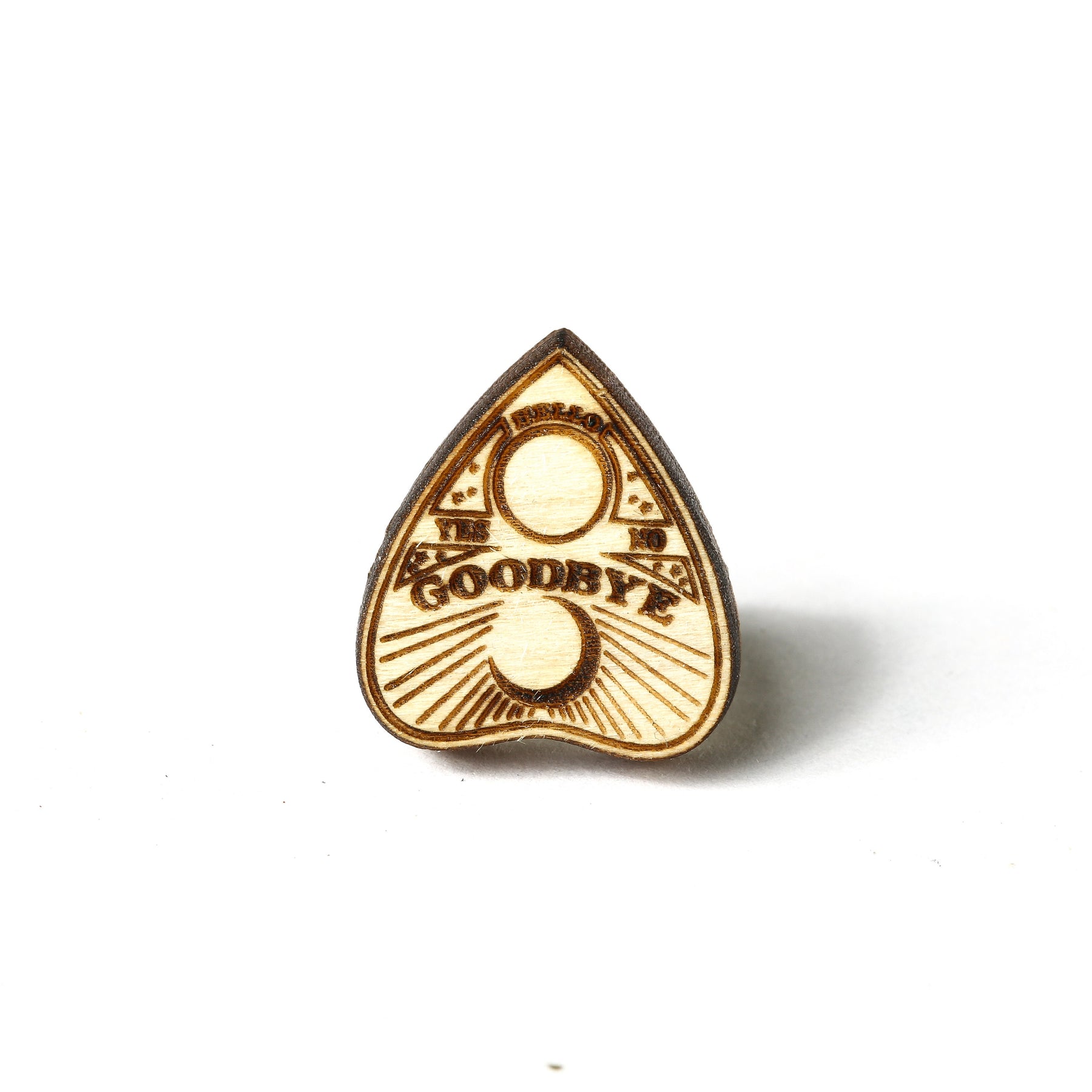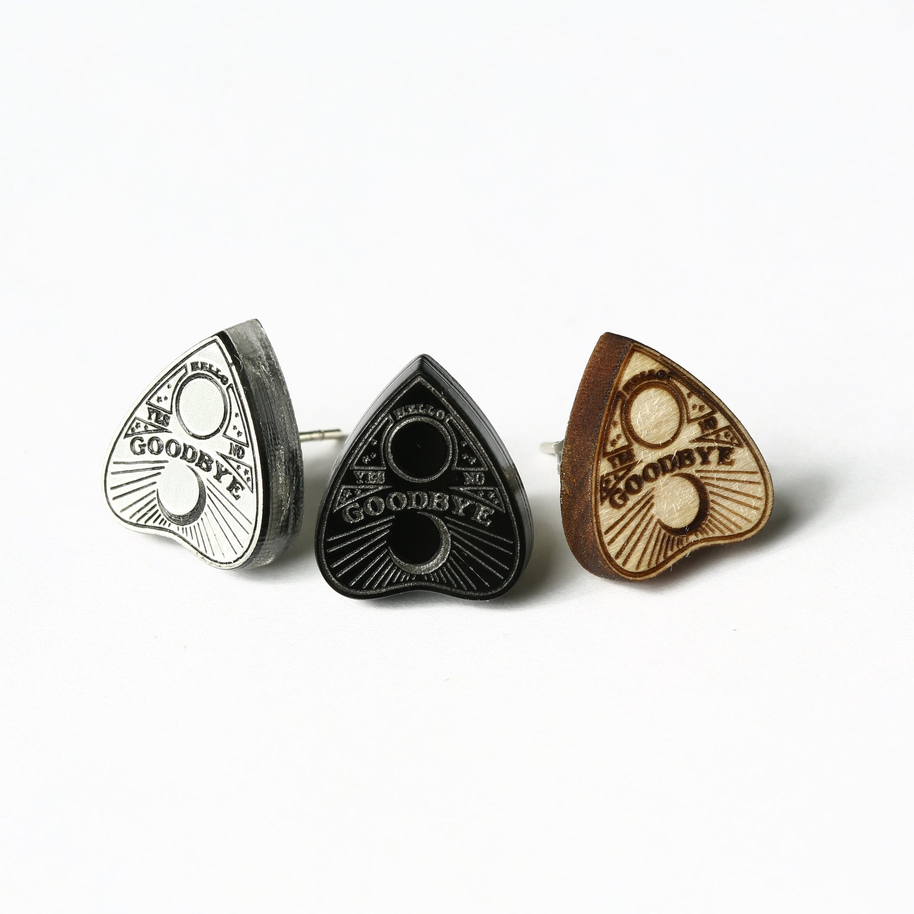 Enjoy the combination of distinctive occult-inspired earrings design and practical comfort. These Ouija Planchette Earrings have been tested for durability and come with a satisfaction guarantee to ensure you love your new favorite accessory. Whether worn daily or saved for special occasions, these lightweight wooden studs make a memorable statement while supporting sensitive ears with surgical steel posts and butterfly nut backs.