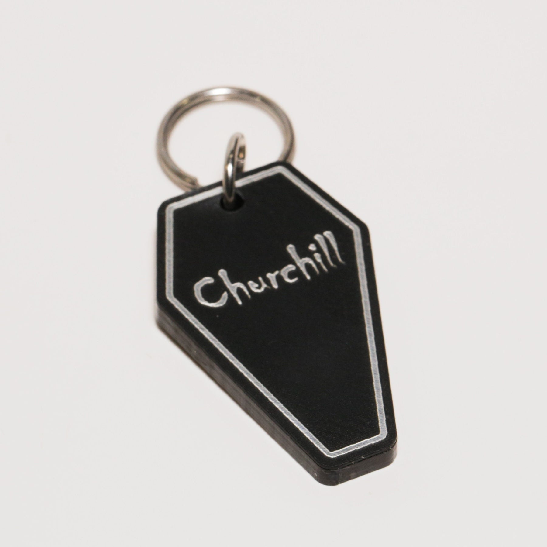 This personalized coffin tag is a unique and spooky pet accessory designed specifically for cats, combining style with practical pet ID tag benefits. Crafted from durable pet tag material, this laser cut acrylic tag ensures your cat’s collar stands out while providing clear identification. Measuring Small at 1.5 x 1 x 0.125 inches and Large at 1.9 x 1.2 x 0.125 inches, the custom name tag for cats fits comfortably on any cat collar tags setup without adding bulk.