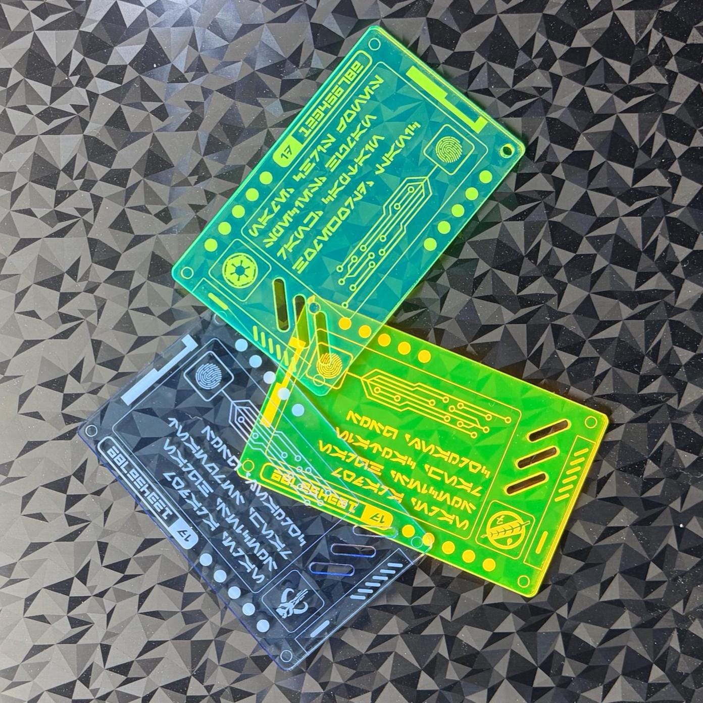Made from premium acrylic, this sci fi badge offers durability and a high-tech look that stands out at conventions or on display shelves. The card is available in multiple vibrant colors including fluorescent green, pink, yellow, blue, gloss black, matte black, and clear acrylic. The fluorescent colors glow brilliantly under UV/blacklight, creating a UV glowing badge effect that enhances any costume or room setup.